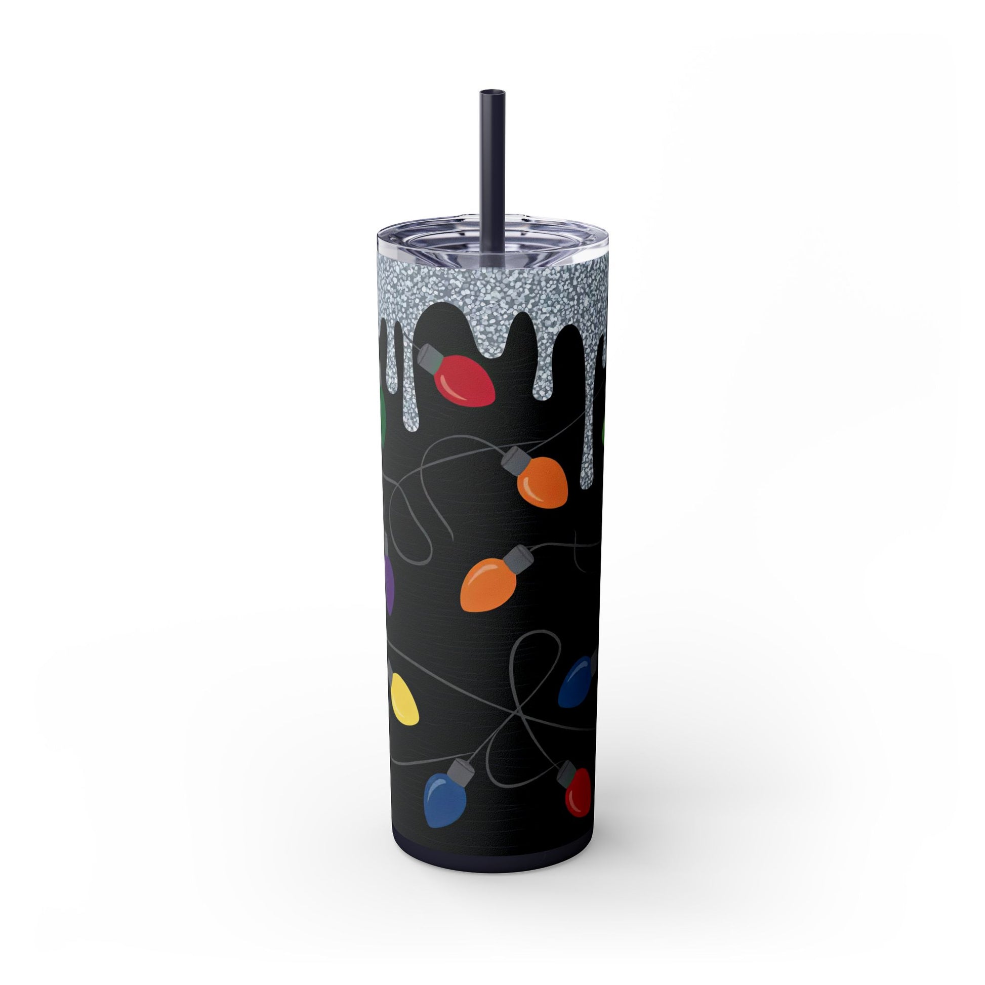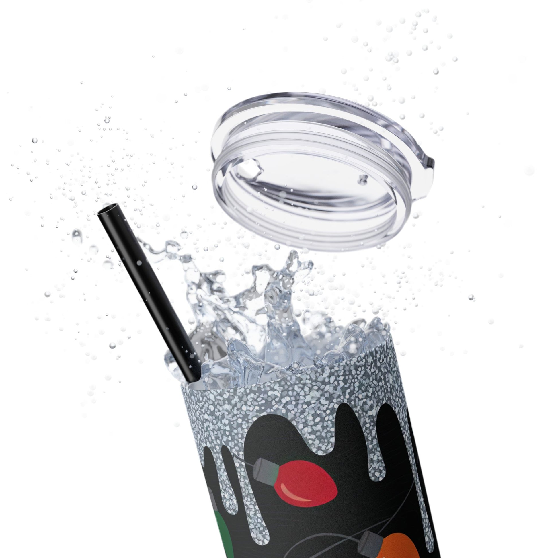 20oz Skinny Tumbler – Black Holiday String Lights Glitter Drip with Straw
